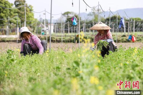 4月16日,贵州省黔南布依族苗族自治州龙里县湾滩河镇,工人在白芨基地除草。连日来,当地天气晴好,民众抢抓农时开展农事活动,田间地头一派繁忙景象。中新社记者 瞿宏伦 摄