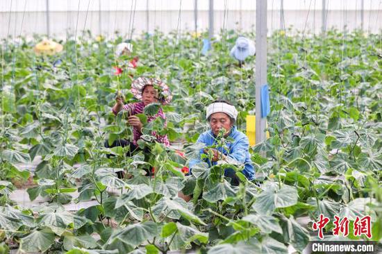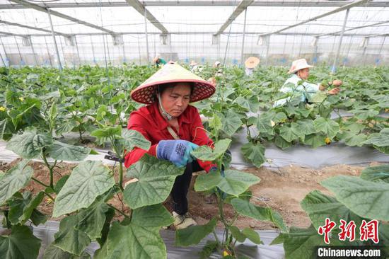 4月16日,贵州省黔南布依族苗族自治州龙里县湾滩河镇,工人在黄瓜基地挂藤。连日来,当地天气晴好,民众抢抓农时开展农事活动,田间地头一派繁忙景象。中新社记者 瞿宏伦 摄