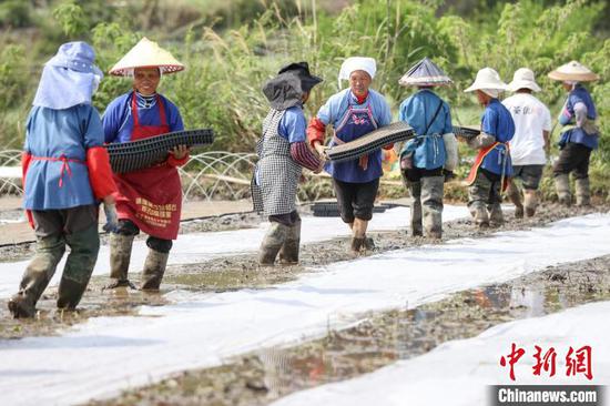4月16日,贵州省黔南布依族苗族自治州龙里县湾滩河镇,工人在育秧基地转移秧苗盘。连日来,当地天气晴好,民众抢抓农时开展农事活动,田间地头一派繁忙景象。中新社记者 瞿宏伦 摄