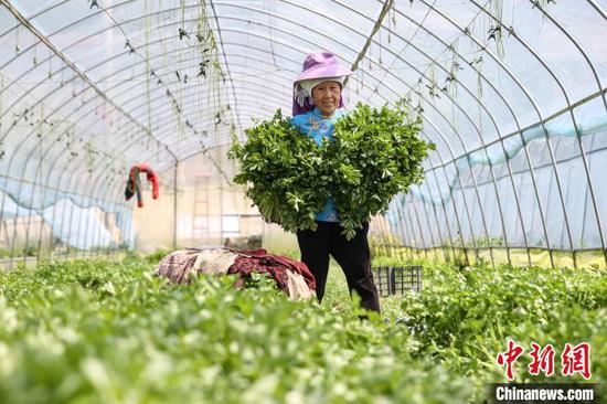 4月16日,贵州省黔南布依族苗族自治州龙里县湾滩河镇,工人在芹菜基地转运采摘的芹菜。连日来,当地天气晴好,民众抢抓农时开展农事活动,田间地头一派繁忙景象。中新社记者 瞿宏伦 摄