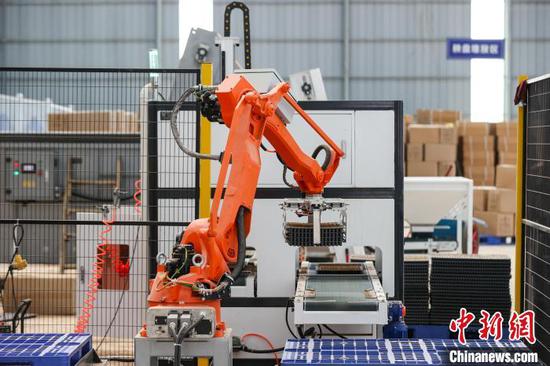 4月16日,贵州省黔南布依族苗族自治州龙里县湾滩河镇,自动化育秧设备在转运秧苗盘。据悉,该套设备每小时能完成600盘育秧任务,效率可提高3倍以上。中新社记者 瞿宏伦 摄