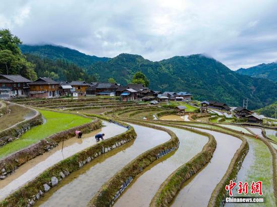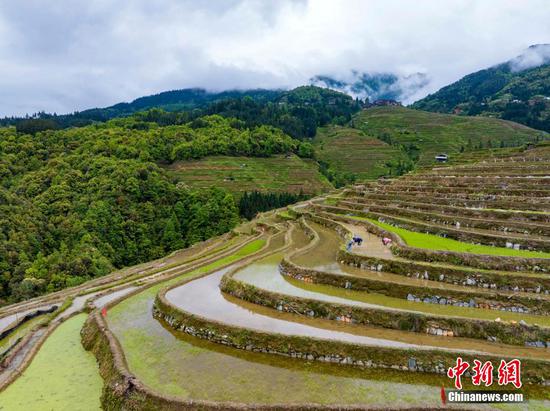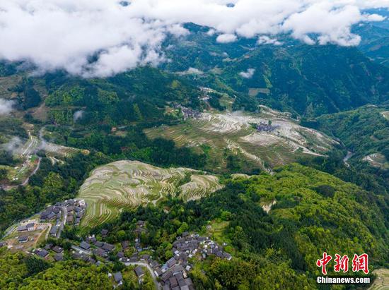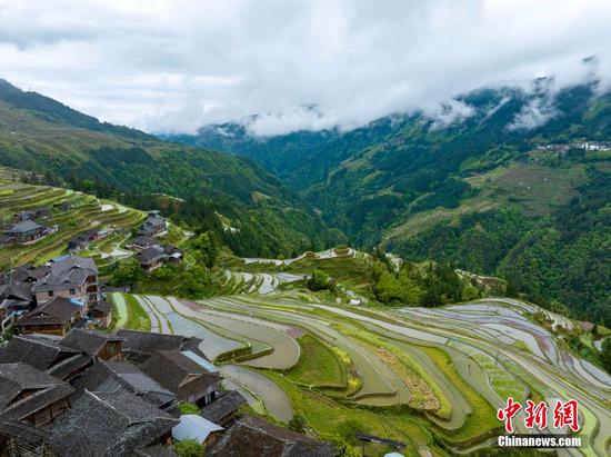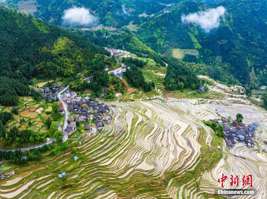 暮春时节,贵州省黔东南苗族侗族自治州从江县加榜梯田雨后格外清新,云蒸雾绕,梯田、苗寨、公路与青山绿水交相辉映,构成了一幅幅色彩斑斓的画卷,美不胜收。 吴德军 摄