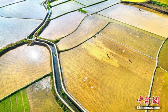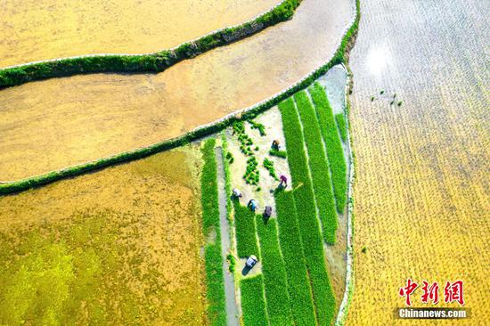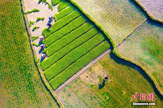 图为农民在贵州省黔西市洪水镇田间扯秧。(无人机照片)史开心 摄