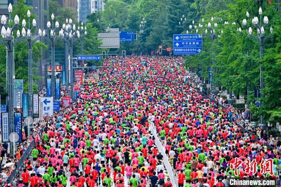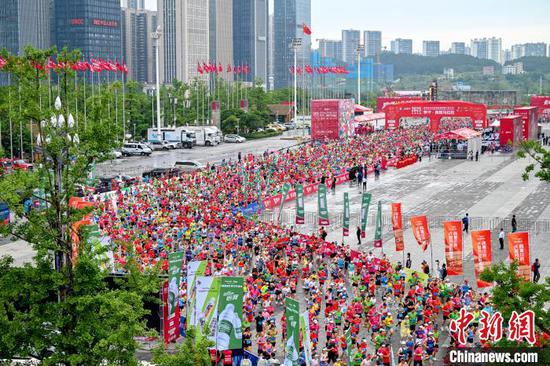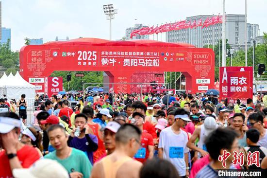 6月15日,2025多彩贵州马拉松超级联赛(第三站)蒙牛·贵阳马拉松在贵阳国际会展中心鸣枪开跑。来自新加坡、肯尼亚、英国、澳大利亚等26个国家和地区,全国34个省、自治区、直辖市以及港澳台地区的3.5万名选手参赛。图为参赛选手在起跑点开跑。唐哲 摄
