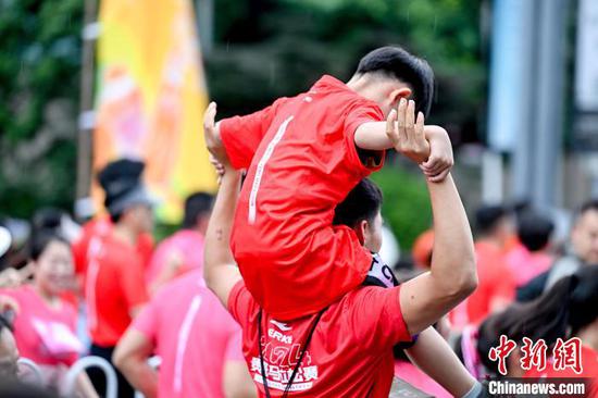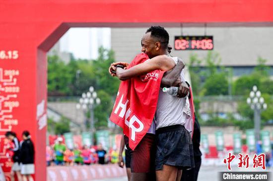 图为参赛选手在全马终点拥抱庆祝。唐哲 摄