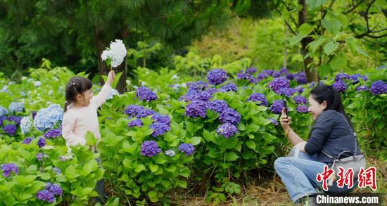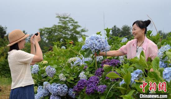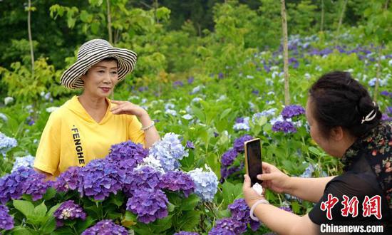 6月15日,贵州省黔南布依族苗族自治州龙里县龙架山国家森林公园雨后吹过阵阵微风,游客趁着凉爽的天气,在公园的绣球花海中游玩、拍照,乐享夏日悠闲时光。图为游客在绣球花海中拍照。石小杰 摄