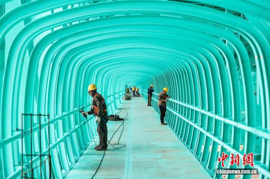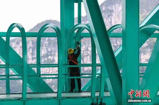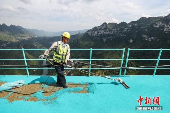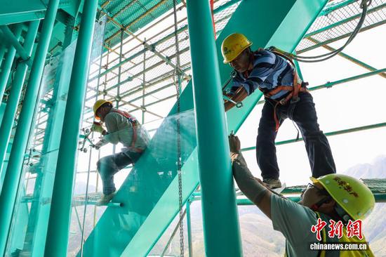 9月4日,工人在贵州六枝至安龙高速公路花江峡谷大桥观景长廊安装玻璃。
