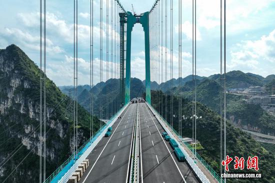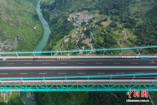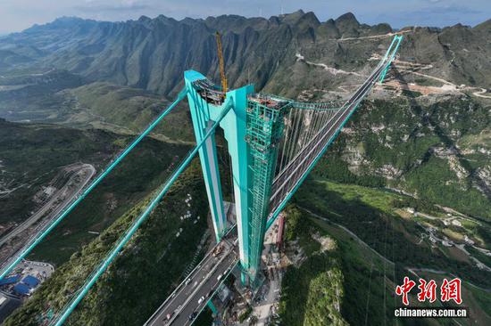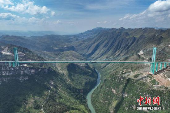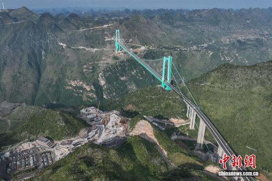 9月4日,航拍贵州六枝至安龙高速公路花江峡谷大桥。该大桥位于贵州省安顺市关岭县与黔西南州贞丰县交界处,全长2890米,桥面距水面625米,高度居世界第一,主桥跨径1420米居山区桥梁跨径世界第一。该大桥还依托其所在的三叠纪地质遗迹资源,以“桥遇三叠纪,云渡古海洋”为主题,构建集“桥梁观光、运动体验、旅游服务”于一体的桥旅融合综合体。目前,花江峡谷大桥已通过荷载试验,桥旅融合项目正在有序施工中,将于9月底正式通车。(无人机照片)(中新社记者 瞿宏伦摄)