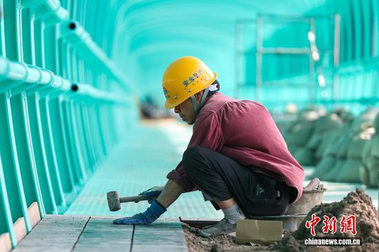 9月4日,工人在贵州六枝至安龙高速公路花江峡谷大桥观景长廊施工。