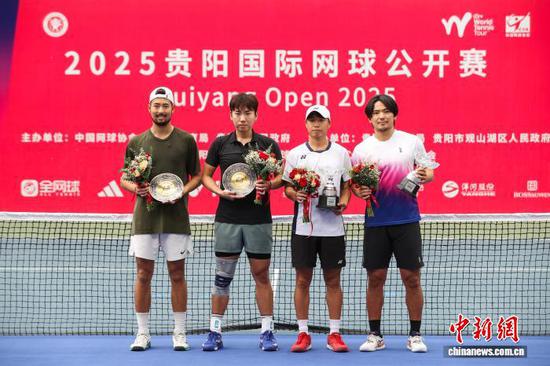 9月20日,黄琮豪(右二)/渡边圣太组合和杨明远/弗格森(左一)组合在颁奖后合影。记者 瞿宏伦 摄