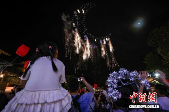 乌江寨无人机烟花秀吸引游客观看。中新社记者 瞿宏伦 摄