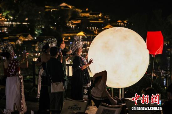游客在乌江寨梯田广场设置的月亮模型前打卡拍照。中新社记者 瞿宏伦 摄