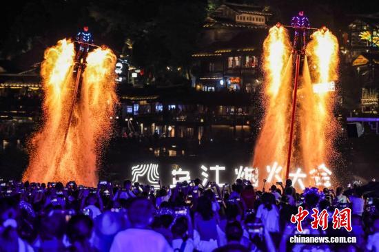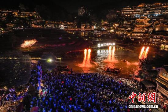 乌江寨的水上飞人火壶、铁花秀吸引游客观看。(无人机照片)中新社记者 瞿宏伦 摄