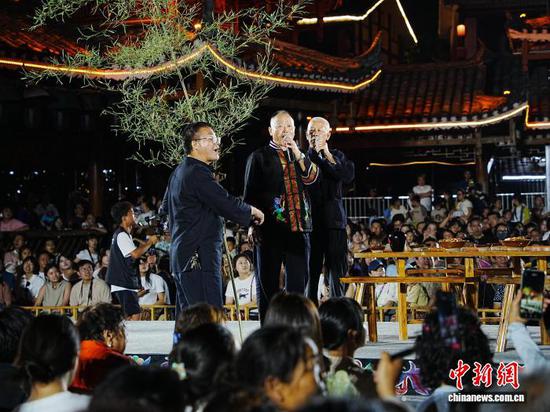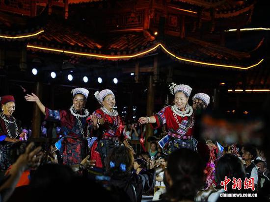 10月5日晚,贵州“村T”舞台上展示苗族婚俗,吸引众多游客前来观看。中新网记者 周燕玲 摄