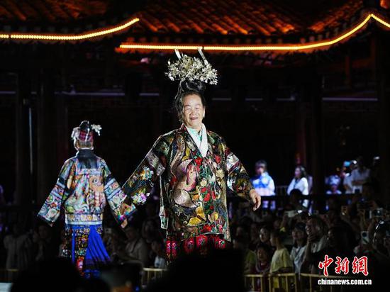 10月5日晚,苗族老人在贵州“村T”舞台上走秀。中新网记者 周燕玲 摄