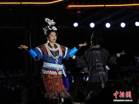 10月5日晚,苗族妇女在贵州“村T”舞台上走秀。中新网记者 周燕玲 摄