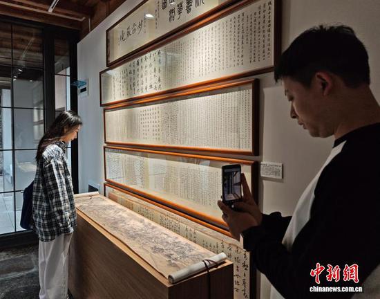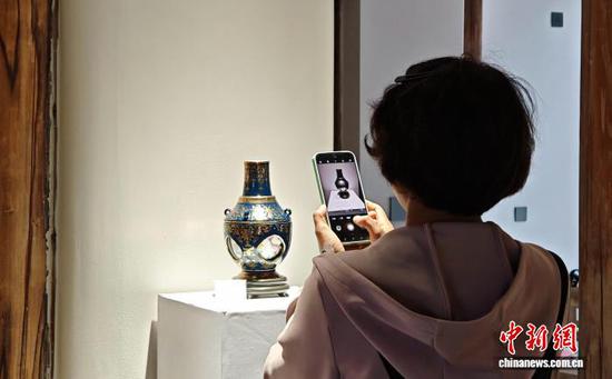 中秋国庆假期,位于贵州省安顺市西秀区旧州古镇的“中华同光——故宫南迁精华文物特展”吸引了众多游客和当地民众参观打卡。特展是2025多彩贵州·第十八届中国原生态国际摄影大展的主题展之一,现场展出了多件台北故宫博物院馆藏文物复制品,通过珍贵的历史影像与实物展示,为参观者唤醒一段抗战时期故宫文物南迁驻留安顺的“国宝记忆”。图为10月6日,游客拍摄“中华同光——故宫南迁精华文物特展”展出的文物复制品。石小杰 摄