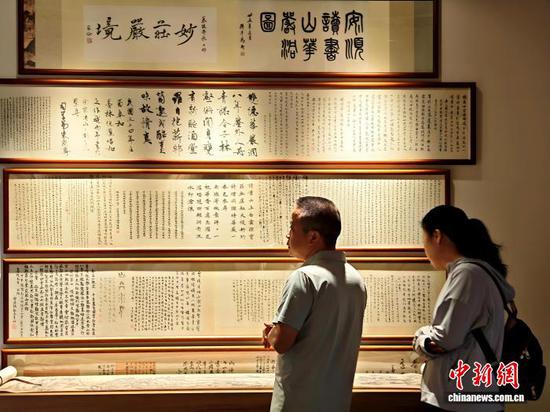 图为10月6日,游客观看“中华同光——故宫南迁精华文物特展”现场的介绍。石小杰 摄