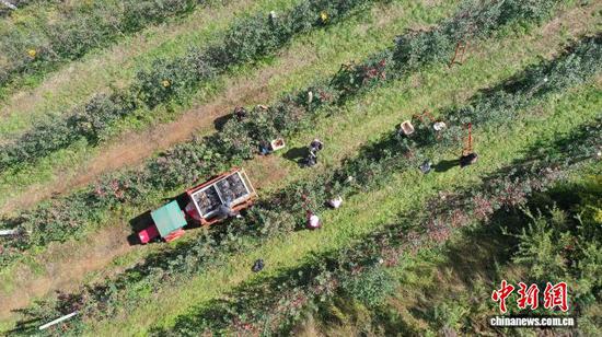 图为11月5日,航拍农户在威宁自治县黑石头镇雨田果园采收苹果。陈逍 摄