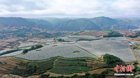 图为11月5日,航拍威宁自治县黑石头镇雨田果园苹果基地。陈逍 摄