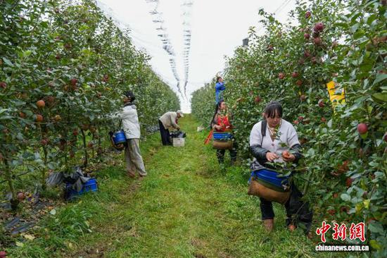 连日来,贵州省毕节市威宁彝族回族苗族自治县种植的晚熟苹果进入集中采收期。近年来,威宁自治县依托高海拔、低纬度的地理优势和独特的气候条件,将苹果产业作为特色优势产业重点发展。目前,威宁自治县苹果挂果面积约15万亩,产量约28万吨,综合产值12亿元人民币,带动近10万户果农增收。图为11月5日,务工群众在威宁自治县黑石头镇雨田果园采收苹果。陈逍 摄