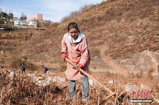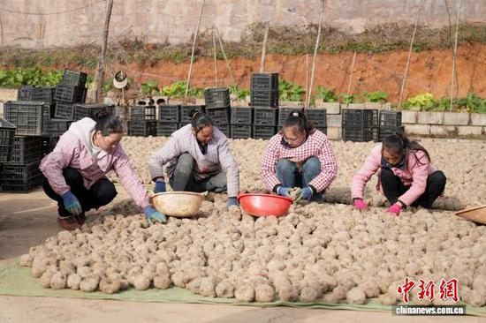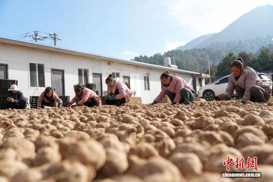 图为12月22日,务工群众在麻乍镇松木坎村翻晒魔芋种子。蔡脒 摄