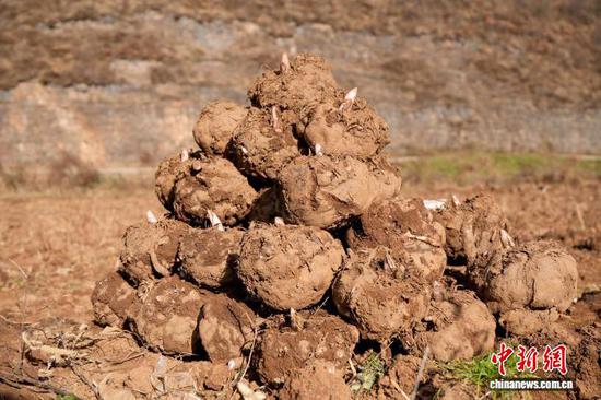图为12月22日,农户在麻乍镇松木坎村魔芋种植基地采挖的魔芋。陈逍 摄
