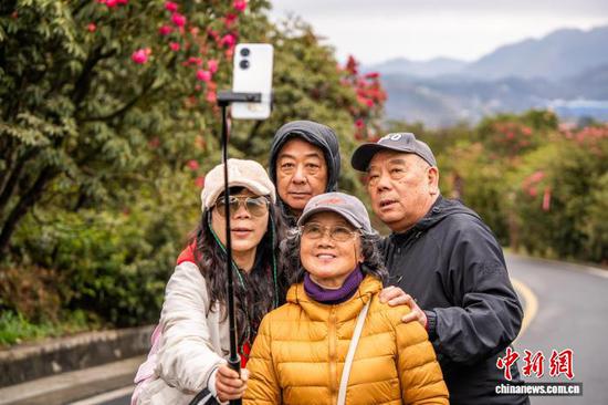 图为3月20日,徒步爱好者们在百里杜鹃景区里拍照留影。 罗大富 摄