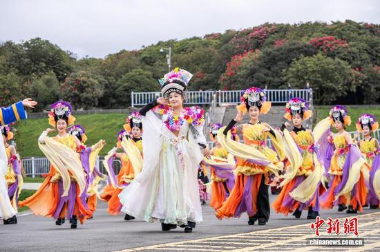图为3月20日,“花仙子”在百里杜鹃景区里为游客巡游表演。罗大富 摄