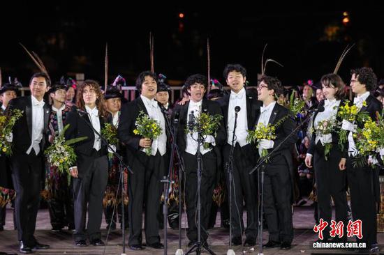 图为耶鲁大学Whiffenpoofs合唱团成员穿着黎平赠送的侗族服饰演唱歌曲。中新社记者 瞿宏伦 摄