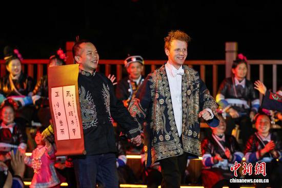 图为耶鲁大学Whiffenpoofs合唱团成员(右)与贵州村T演员一起走秀。中新社记者 瞿宏伦 摄