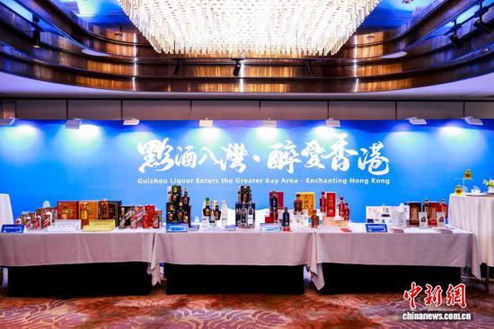 11月5日,“2025贵州·香港投资贸易交流座谈会”在香港举行。图为黔酒、黔茶、刺梨、伴手礼、文创等贵州农特产品展示及品鉴区。(贵州省商务厅供图)