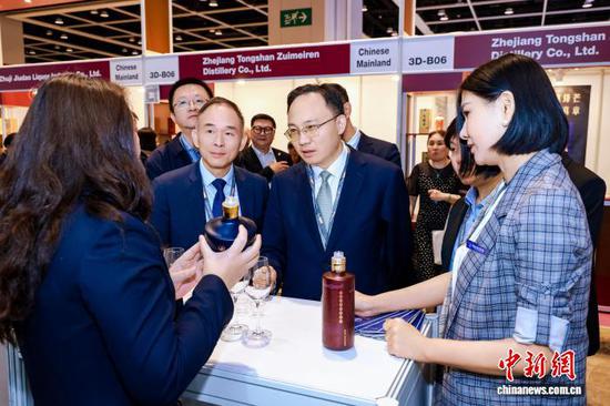 中新网香港11月6日电 (华净雯)11月6日,在香港国际美酒展举办之际,贵州省商务厅组织该省20家白酒企业参展,并举办黔酒全球行之“黔酒入湾·醉爱香港”专场对接会活动。作为“2025贵州·香港投资贸易活动周”系列活动之一,本次活动旨在依托香港国际化平台优势,推动贵州白酒加快融入粤港澳大湾区,深化黔港两地产业协作与文化交融。
