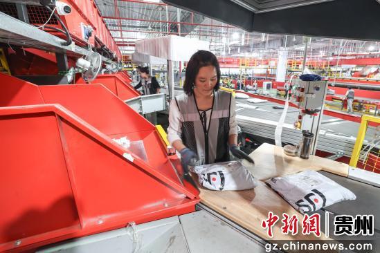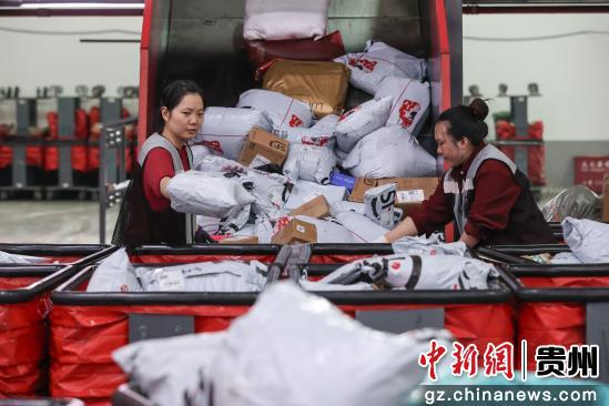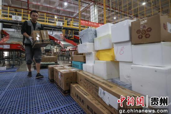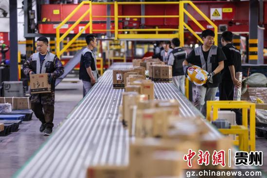 图为贵州顺丰贵阳双龙中转场工作人员在分拣快递。 瞿宏伦 摄