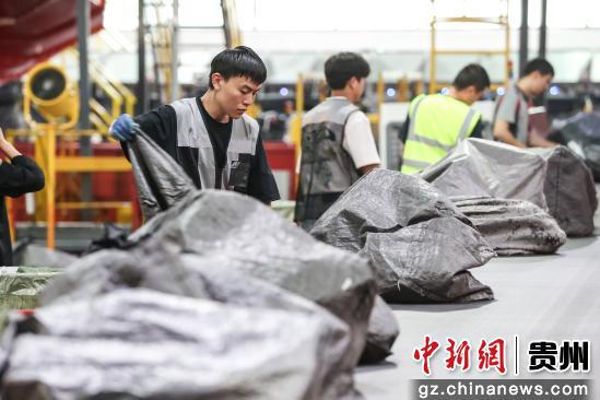 图为贵州顺丰贵阳双龙中转场工作人员将快递拆包。 瞿宏伦 摄
