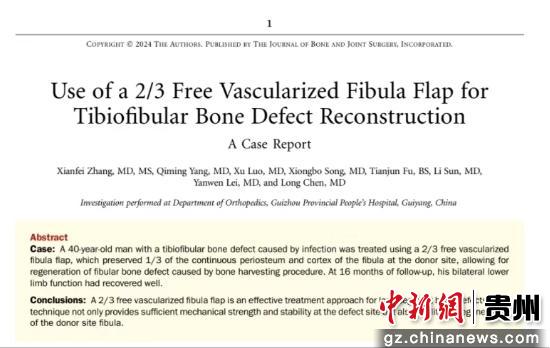 中新网贵州新闻12月12日电 近日,贵州省人民医院骨科副主任陈龙和雷彦文副主任医师团队在下肢长节段骨缺损的修复重建领域取得重大突破,创新传统模式,为一位40岁因重物砸伤致左侧胫腓骨下段开放性骨折(Gustilo III)的男性患者采用2/3游离血管化腓骨瓣治疗胫腓骨骨缺损,术后骨缺损修复效果良好,供区功能还得到了较好恢复。这一创新术式,登上了全球骨科领域国际顶级期刊“JBJS”——《骨与关节外科杂志(美国版)》。