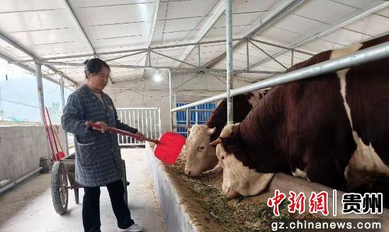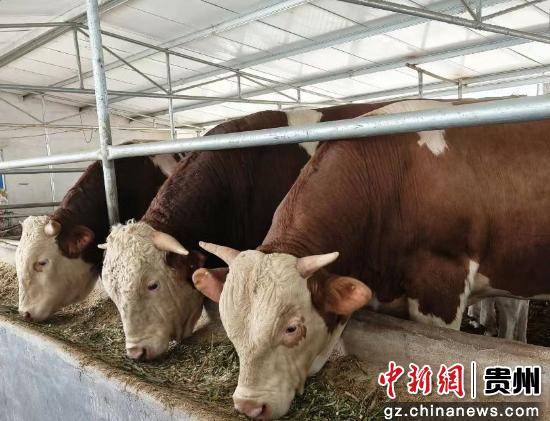 中新网贵州新闻12月12日电 (罗浩)“哞……哞……”走进贵州沿河土家族自治县中界镇罗家寨村,远远便听到阵阵悠长的牛叫声。在该村肉牛养殖基地里,一排排整洁干净的牛舍映入眼帘,工人正忙着清理圈舍、投饲喂草,一头头膘肥体壮、毛色发亮的西门塔尔牛正悠闲地吃着饲料。