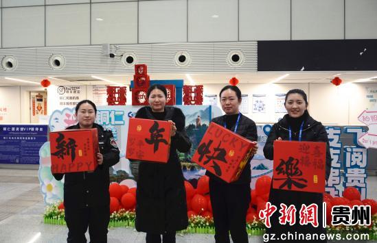 图为贵州省铜仁凤凰机场的机场工作人员展示“新年快乐。申逸恺摄