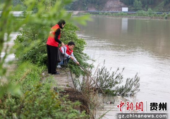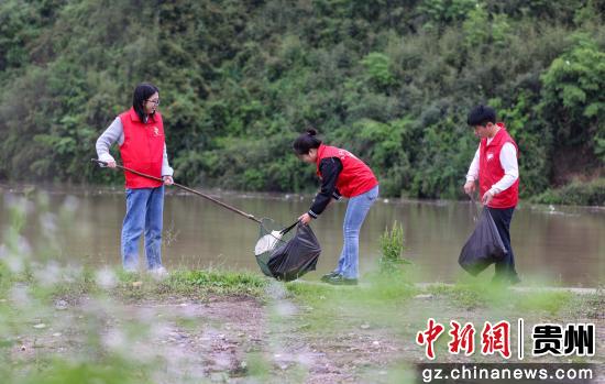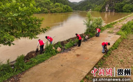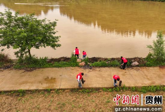 图为青年志愿者在玉屏侗族自治县新店镇洞坪村龙江河畔清理垃圾杂物。