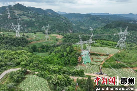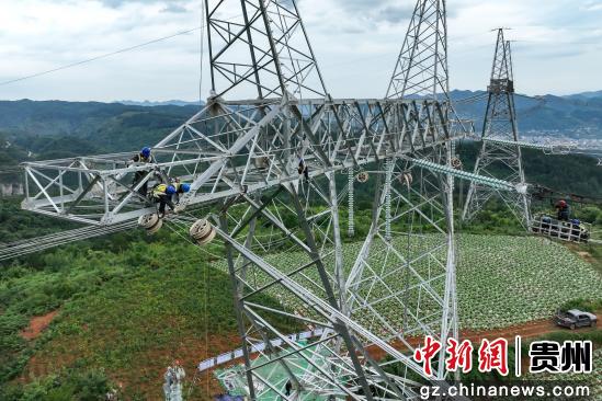 中新网贵州新闻6月23日电 (记者 瞿宏伦)近日,记者走进位于贵州省毕节市赫章县境内的贵州(威宁)乌撒至(大方)奢香第二回500千伏线路工程(标段二)施工现场看到,工人忙于输电线路绝缘子串安装工作,一派繁忙景象。