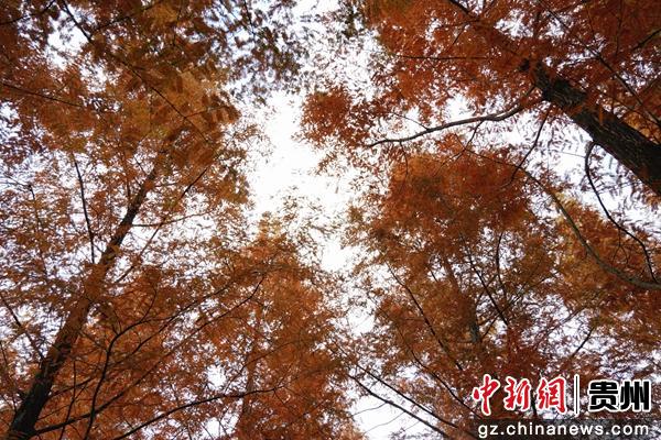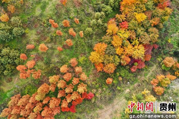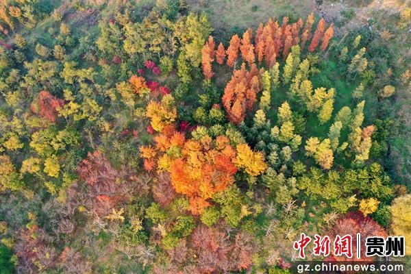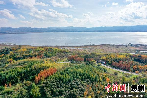 进入初冬,贵州省毕节市威宁彝族回族苗族自治县草海北坡生态公园秋韵尚存,树木叠翠,红、橙、黄、绿等色彩交织,风景如画。