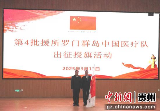 中新网贵州新闻3月14日电(梁硕)3月13日下午,第四批援所罗门群岛中国医疗队出征授旗仪式在中山一院贵州医院(贵医附院贵安院区)举行。