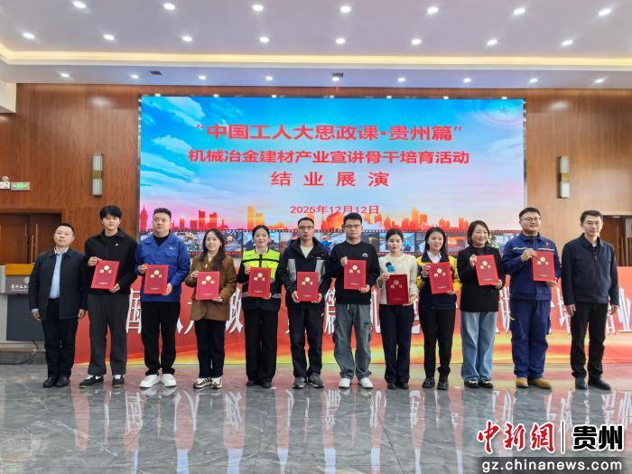 中新网贵州新闻12月16日电 (潘婧)2025年度“中国工人大思政课・贵州篇”机械冶金建材产业宣讲骨干培育活动日前在贵州铝业技师学院举行。贵州省建设投资集团有限公司工会精心选派的两名宣讲骨干赵偲琪、唐琦,在培训期间表现优异,被聘为“贵州省机械冶金建材工会2025年“工人大思政课”宣讲骨干,并作为优秀学员代表进行宣讲展演,她们以生动鲜活的故事、真挚饱满的情感,展现了建投人坚守初心、担当作为的精神风貌,赢得了现场观众的热烈反响与广泛赞誉。