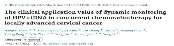 中新网贵州新闻4月3日电 近日,贵州省人民医院肿瘤科李勇博士、张汉群博士在国际知名期刊 npj Precision Oncology(中科院1区top, IF=8)发表研究论文,该论文聚焦局部晚期宫颈癌同步放化疗后复发监测这一临床难题,在国内首次前瞻性验证了血浆ctHPV-DNA MRD动态监测在评估宫颈癌治疗疗效及预测复发中的临床价值。