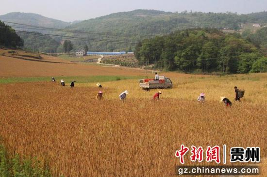 今天为大家推荐的每日一图是贵州省息烽县的农户们在田间进行小麦收割作业。息烽县融媒体中心供图
