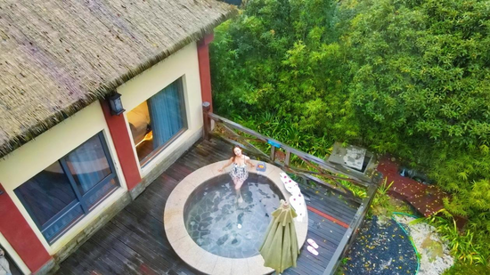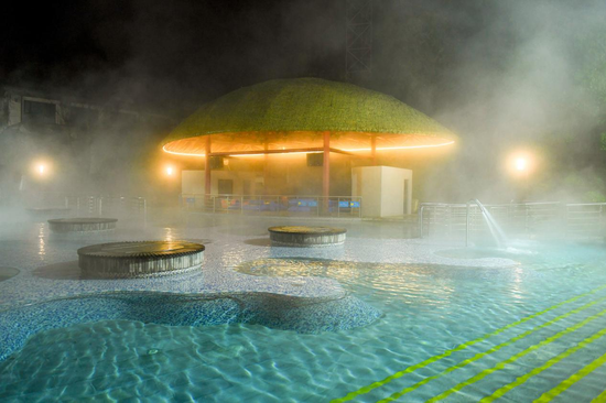 据了解,度假区室外温泉区占地面积约28000㎡,温泉水全部采自地下2500米的天然矿泉,富含氡、锶、硒、偏硅酸等多种对人体有益的矿物质和微量元素,属世界三大氡泉之一。65泓纵横交错、形态各异的温泉汤池散落在山谷之中,游客们可以在这里尽情享受温泉带来的舒适与惬意,同时还可以体验图腾水疗、半山无边泳池和亲子游乐嬉水设施,享受家庭度假的乐趣。