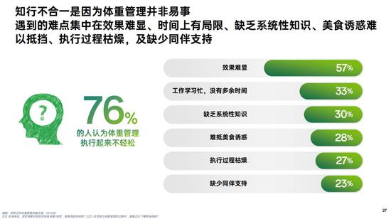 《白皮书》指出,76%的人认为体重管理并不轻松,其中效果难显是最大挑战!此外还面临时间局限、缺乏系统性知识、美食诱惑难挡、过程枯燥及缺少同伴支持等多重困境。