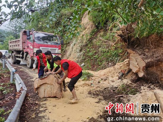 雷山县乔配村党员干部在清理主干道伏倒树桩。
