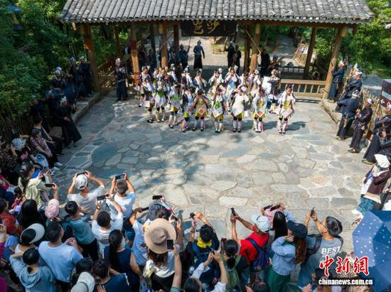 今天为大家推荐的每日一图是贵州省黔东南苗族侗族自治州从江县岜沙苗寨迎来旅游旺季,游客在岜沙苗寨观看迎宾仪式表演。吴德军 摄