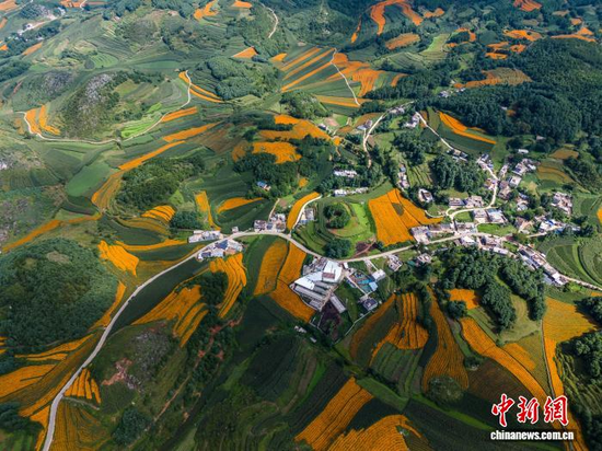 今天为大家推荐的每日一图是航拍贵州威宁自治县双龙镇高坡村万寿菊种植基地。罗大富 摄